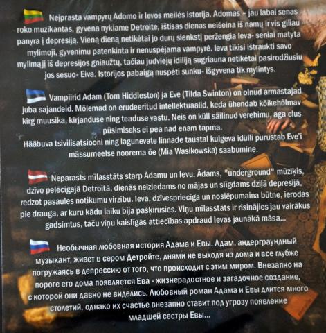 DVD filmas 'Išgyvena tik mylintys' / 'Only Lovers Left Alive' (2013 metai). Žanras: drama, siaubo, romantinis. Filmas įgarsintas lietuvių, anglų, rusų kalbomis. Subtitrai: lietuvių, latvių, estų, rusų. Trukmė: 118 min. Režisavo: Jim Jarmusch. Trailer: https://www.youtube.com/watch?v=ycOKvWrwYFo Dėl kainos ar daiktų mainų galime derėtis.