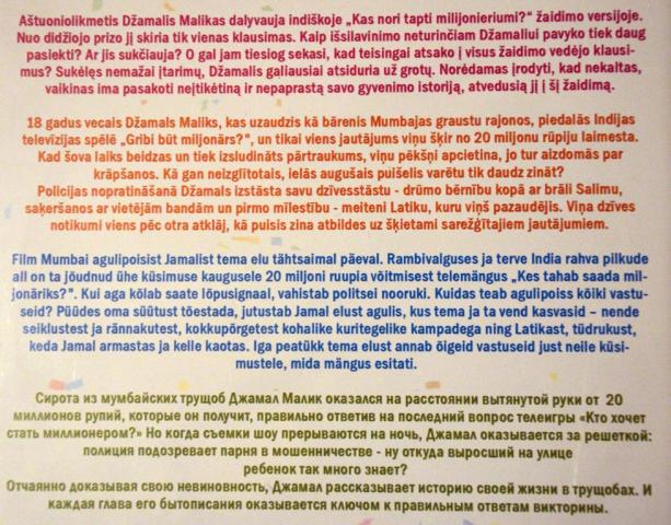DVD filmas 'Lūšnynų milijonierius' / 'Slumdog Millionaire' (2008 metai). Žanras: drama, kriminalinis, romantinis . Filmas įgarsintas lietuvių, angų, latvių, rusų kalbomis. Subtitrai: lietuvių, latvių, estų, rusų. Trukmė: 115 min. Režisavo: Danny Boyle, Loveleen Tandan. Trailer: https://www.youtube.com/watch?v=AIzbwV7on6Q Dėl kainos ar daiktų mainų galime derėtis.