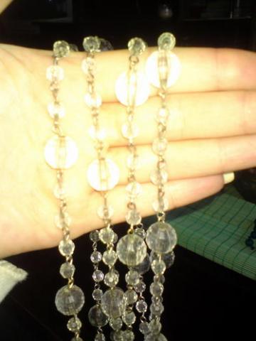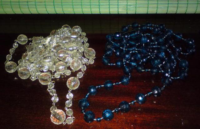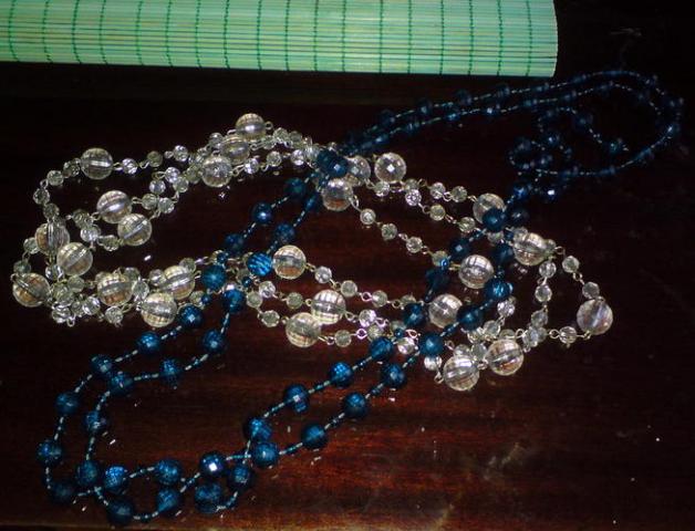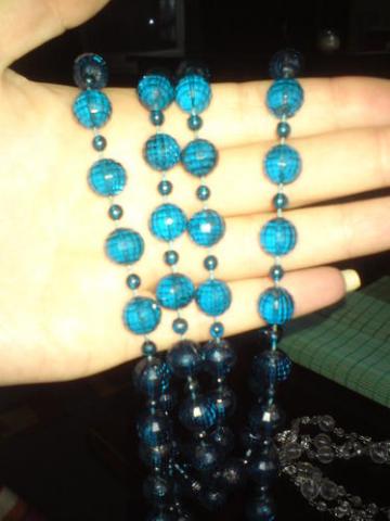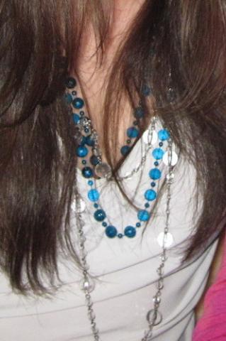 Turkio spalvos ir permatomi karoliai is New Yorker nesioti, taiau puikios bukles, neapsitryne, graziai zvilga.