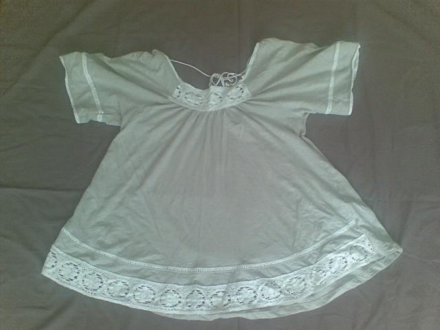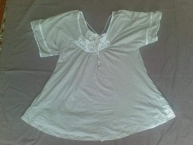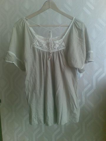 Platėjanti palaidinė iš medvilnės su nėrinukais. Dydis M/L. Labai tinka nėštukėms (pati nešiojau per nėštumą, labai patogi). Smėlio spalvos, nėriniai baltos. Vienoj pusėj yra nėriniai apačioje, kitoj nėra. Dėl to galima nešiot dviem būdais - kai apatiniai nėrinukai matosi priekyje, arba nugaroje :) Yra raišteliai. Turiu tokią pat juodą. Būklė abiejų puiki. Vnt kaina 25 Lt
