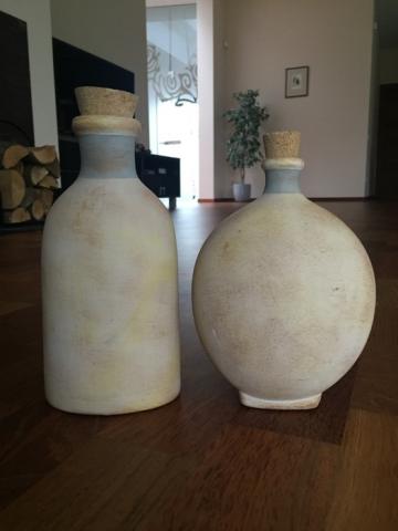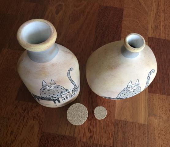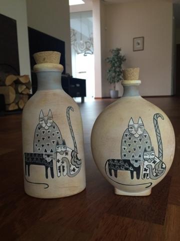 Dvi degto molio vazos su katinais. Didesnės aukštis su kamščiu 21 cm, mažesnės 19. Plotis 10 ir 12 cm.