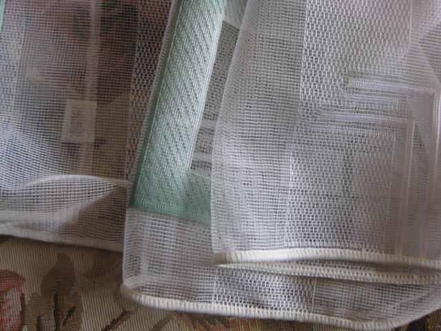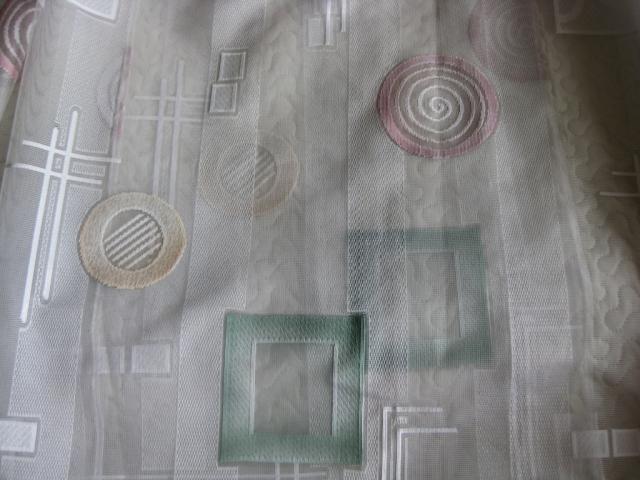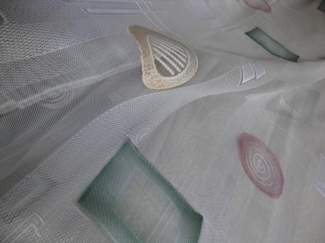 Gražios vokiškos užuolaidos su pastelinių spalvų apskritimais ir kvadratais. Su švino begeliu per apačią. Siūtos užuolaidų salone. Aukštis 2.48 m. Plotis 1.92 m. Defektai matosi foto.