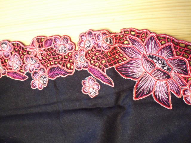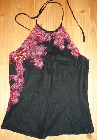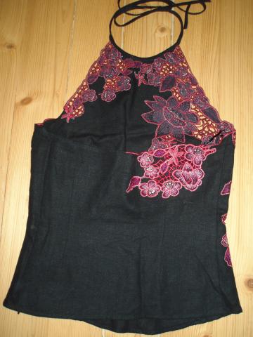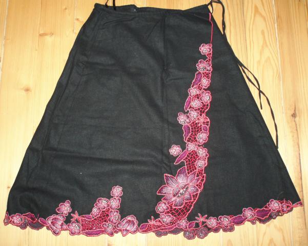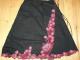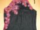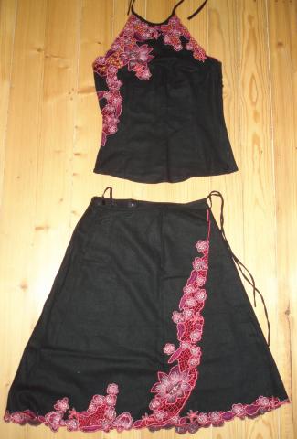 Dviejų dalių - bliuzelės ir sijono - juodas ir rausvais motyvais peltakiuotas kostiumėlis panelei. Tinka apie 170 cm ūgio panelei. Bliuzelė surišama ant kaklo. Sijonas susiaučiamas. Sudėtis: 55 proc. lino, 45 proc. viskozė.