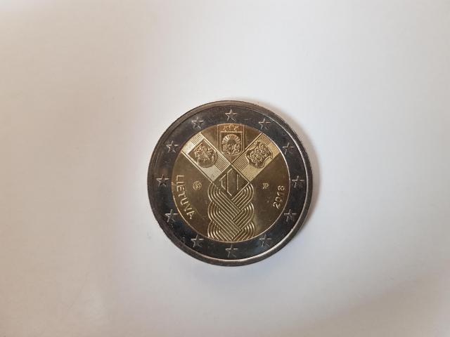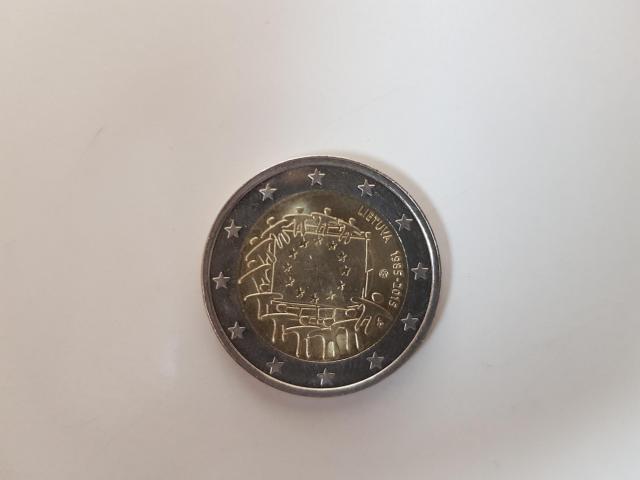 Mainams 2 eurų lietuviškos monetos ir 1 cento moneta su edelveiso atvaizdu.