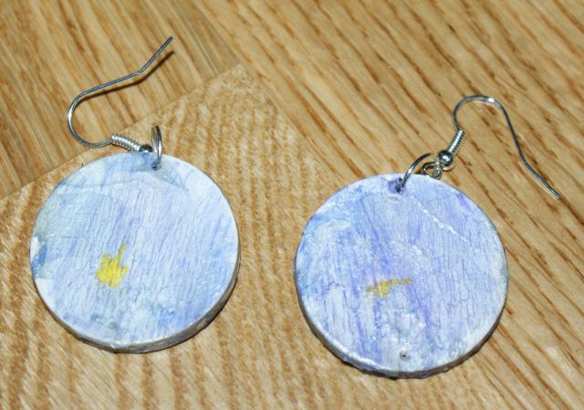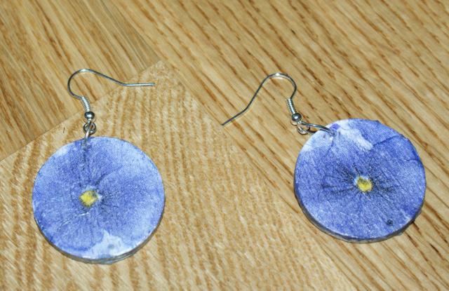 Dvipusiai dekupažuoti auskarai iš vienos pusės violėtinė gėlė o iš kitos balta.