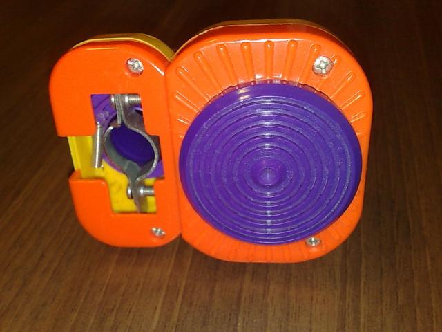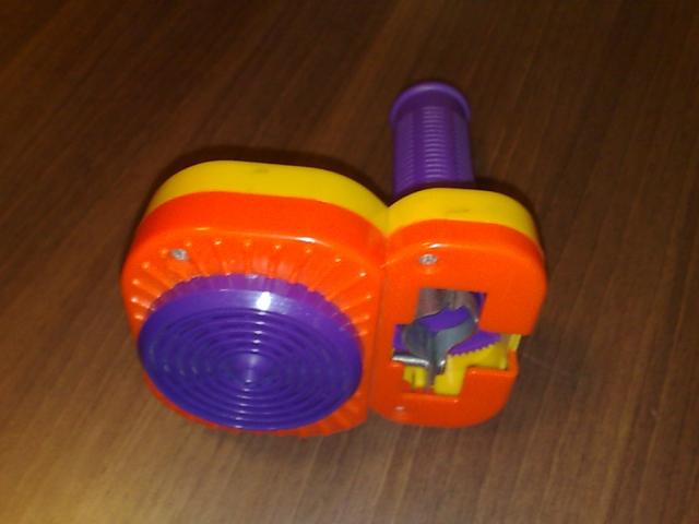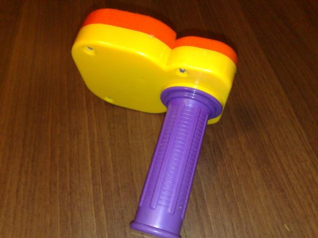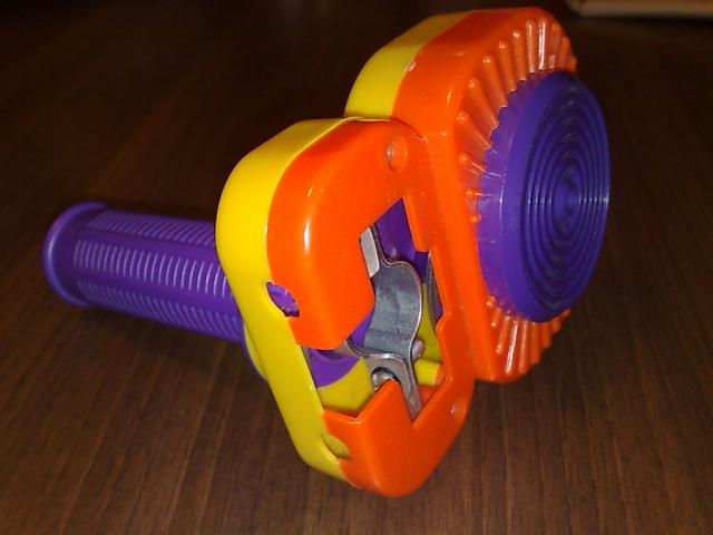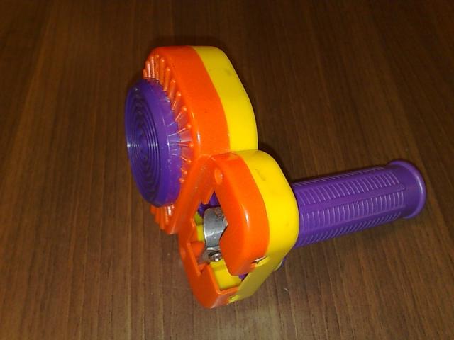 Detalė, tvirtinama prie dviračio vairo. Pasukus violetinę rankeną pasigirsta dėmesį atkreipiantis perspėjimo signalas - lyg 'užvedamo variklio garsas'. (c)