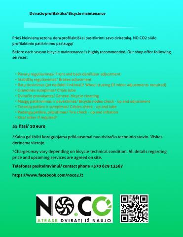 NO.CO2 siūlo ne tik dviračių taisymo paslaugas, tačiau ir "custom" dažymą su rankų darbo piešiniais ant rėmo. Aukčiausios kokybės dažymo darbai!!!. Restauruojame dviračius. Parduodame dėvėtus. Įdomus bet koks projektas, susijęs su dviračiais. Kadangi nesame įsikūrę prabangiose patalpose, galim pasiūlyti geras kainas.