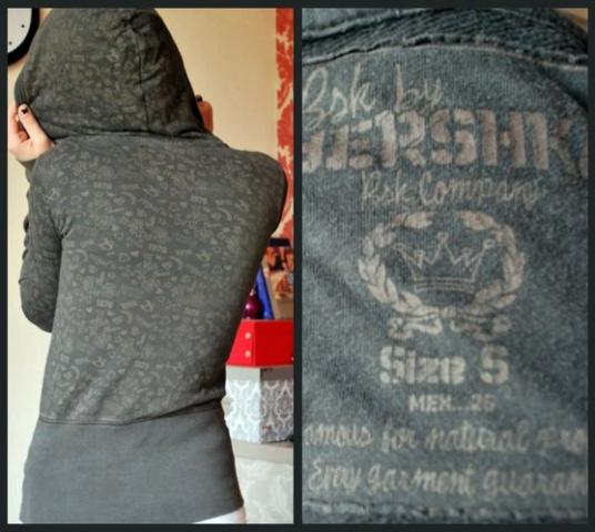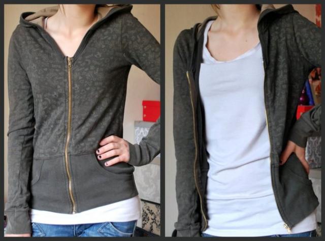 rudas raštuotas džemperis, su kapišonu ir užtrauktuku