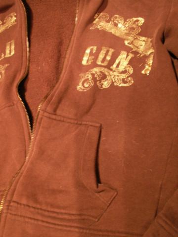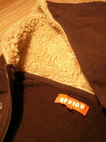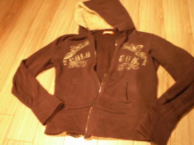 Rudas, užtrauktuku užsegamas šiltas džemperis, dvi kišenės, baltas kailiukas kapišone, pats džemperio vidus pašiltintas šiek tiek.