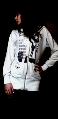 Gražus, ilgokas džemperis su įvairiais užrašais ir piešiniais. Su gobtuvu, užsegamas užtrauktuku, su dvejomis nedidelėmis kišenėlėmis. Labai gražiai atrodo prie timpių.