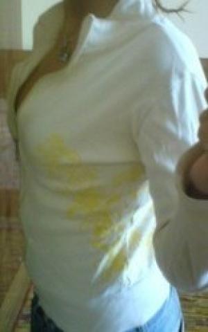 užsegamas džemperiukas su geltonu piešinėliu.