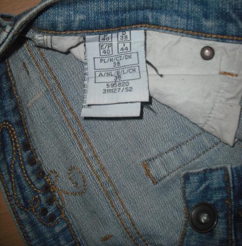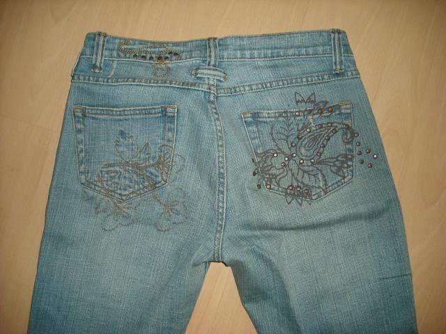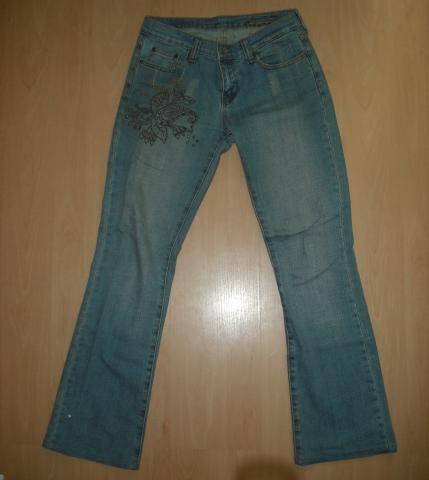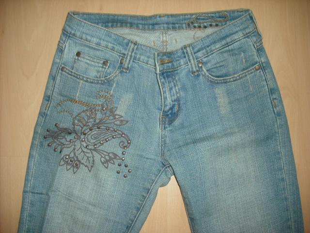 Patogūs, gražios išvaizdos, geros būklės džinsai puošti kniedėmis ir gėlių raštais, su pasitrynimais, kurie dabar madingi, padalkės nenunešiotos. Liemens apimtis: 83-84cm; Klubu apimtis 93cm; ilgis nuo klyno 77cm; nuo klyno iki viršaus 21cm. Tempiasi.