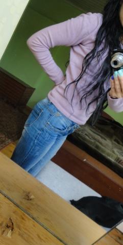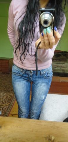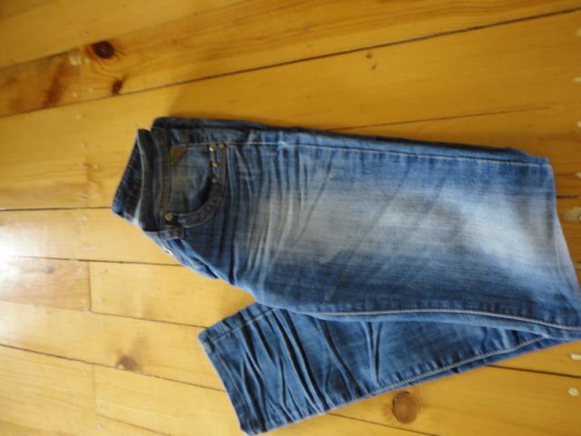 Mėlynos spalvos aptempti džinsai šiek tiek blukinti