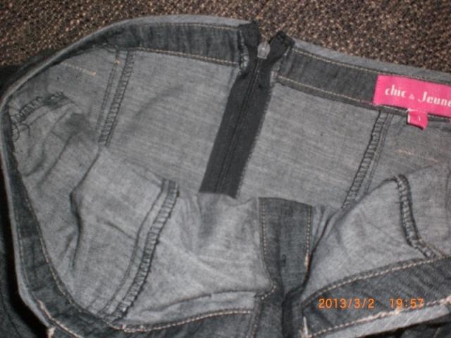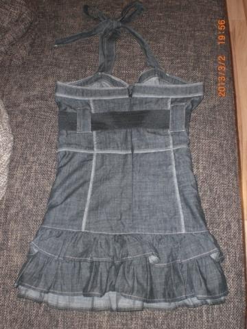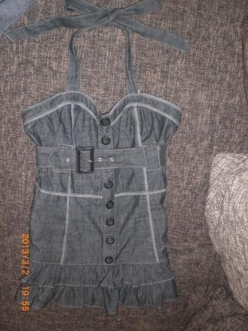 Jokių defektų, juodo džinso, šiek tiek tamposi, diržas nugaroje su guma. Dengia klubus, petnešėlės surišamos. Užsisega šone užtrauktuku