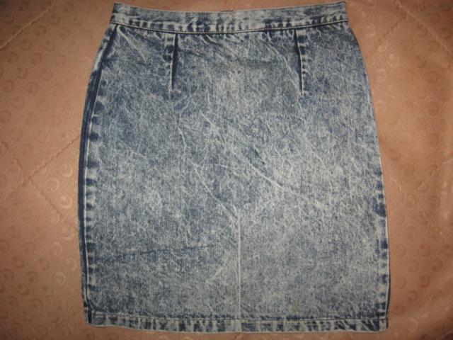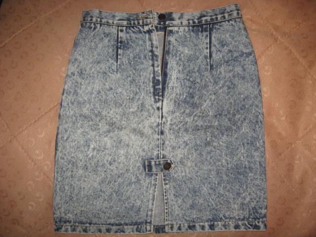 Džinsinis sijonukas, melsva + balta spalva, pagal US 14 dydis, užpakalyje skeltukas. Liemuo 70 cm, klubai 86 cm, ilgis 48 cm.