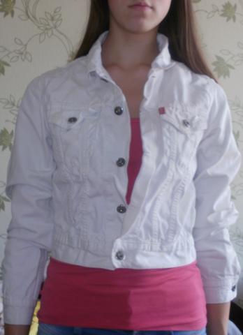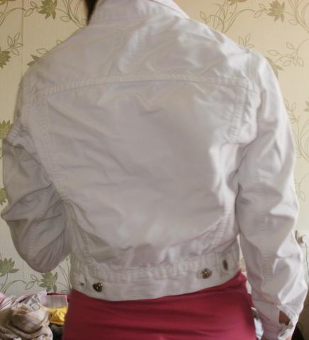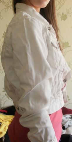Baltos spalvos džinsinis švarkelis, yra vienas mažas defektėlis kurio beveik net nesimato, buvo įdėtas plauti su rūžava maikute, todėl vienoje vietoje yra truputuka pablukes, bet manau išbalinus dėmė turėtų pranykti.