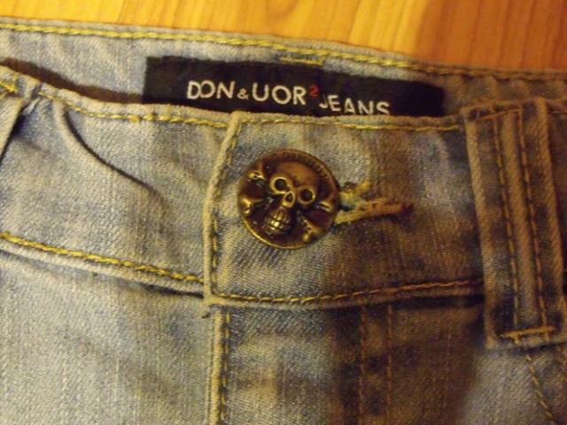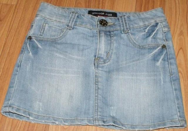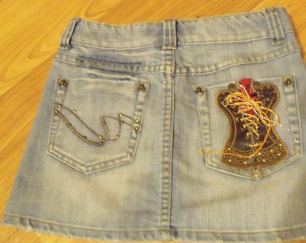 Džininis sijonėlis, dydis būtų XS. Sagutė su kaukolyte, gale piešinukas su raištukais.