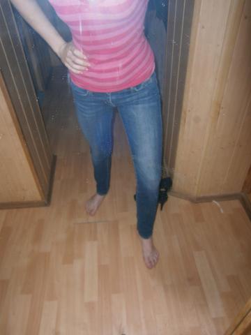 Siaurėjantys,melyni džinsai. Pačiame gale,ties susiaurėjimo pabaigą yra užtrauktukai