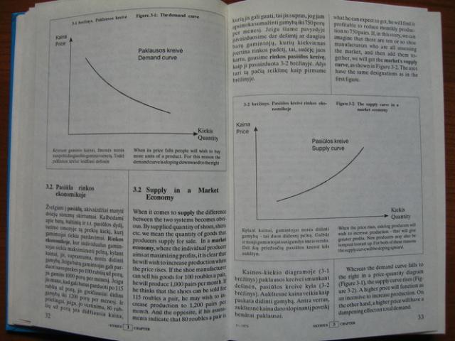 "Ekonomikos pagrindai. Perėjimas nuo plano prie rinkos." 1992 m. Knyga sena, na bet gal kam ir pravers. Kiekvienas puslapis perskeltas į 2 dalis ir tas pats tekstas pateiktas ir lietuviškai, ir angliškai.