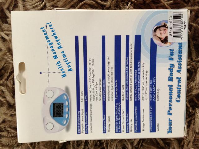 Yra lt instrukcija, dedasi baterija, kurios kaina apie 5 lt. Ivedus lyti, svori, ugi, amziu parodo kiek riebalu turite. Tiks sportuojantiems matuoti pasiektus rezutatus. Naujas.