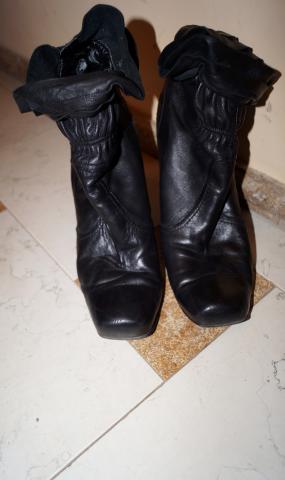 Labai gražūs ir elegantiški. Odiniai, pagaminti Italijoje. Kulnas aptartauktas oda ir prie apačios ji nusigramdžiusi. Galima kažką sugalvoti ir susitvarkyti. Vidpadis apie 25 cm, kulnas 9 cm. Kulnas pakaltas metalu, tad ilgaamžis.