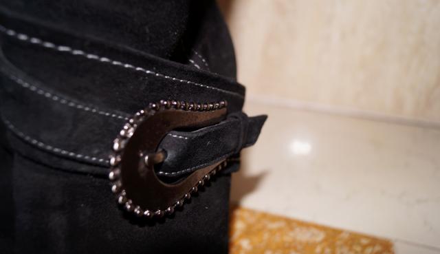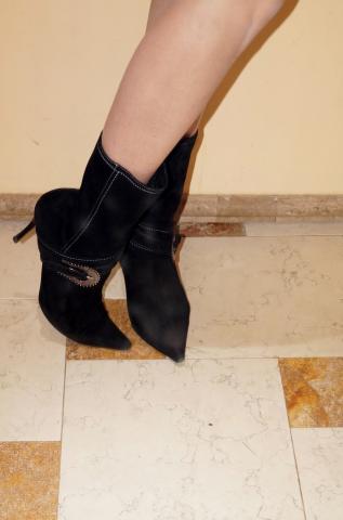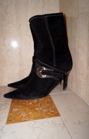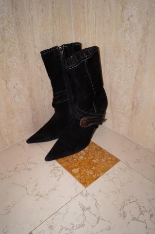 Zomšiniai juodi elegantiški ir puošnūs batai. labai kokybiški. Mokėjau nemažai. Kaip nauji nebeatrodo, bet didesnių defektų nėra. Nosyčių priekiai trupučiuką pasidėvėję, bet matosi tik apžiūrinėjant. Užsidėjus ant kojos nesimato, nes labiau link pado defektukas. Kulniukas pasibraižęs, bet ne bėda, paprasta juodai uždažyti. Kulniukai pakalti metaliukais, tad bėdų nebus - ilgaamžiai. Kulniuko aukštis 10 cm, vidpadis apie 25 cm.