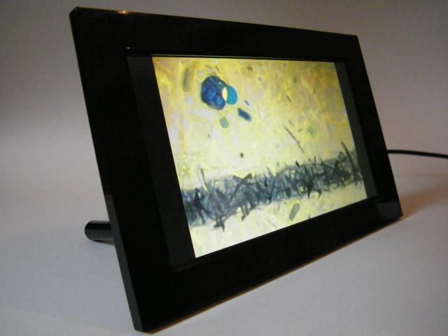 įstrižainė 7'', nuotraukos įkeliamos per USB jungtį, SD atminties kortelę, naudotas
