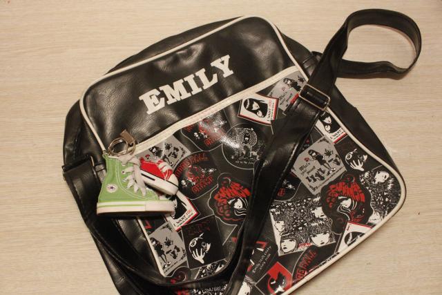 Emily rankinė, sugedęs užtrauktukas, vienoje vietoje nedidelė skylė(lengvai pataisoma). Talpi, patogi, tvirta, 2 kišenės ir pagrindinis skyrius. Pridedu du fainus batukus-pakabukus