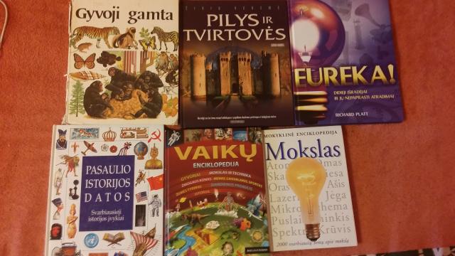 Vaiku enciklopedija 13 euru. Gyvoji gamta 3 eur. Mokslas 4 eur. Pasaulio istorijos datos 3 eur. Pilys ir tvirtoves 3 eur. Eureka 4 eur. Perkant viska kaina mazesne. Vilnius