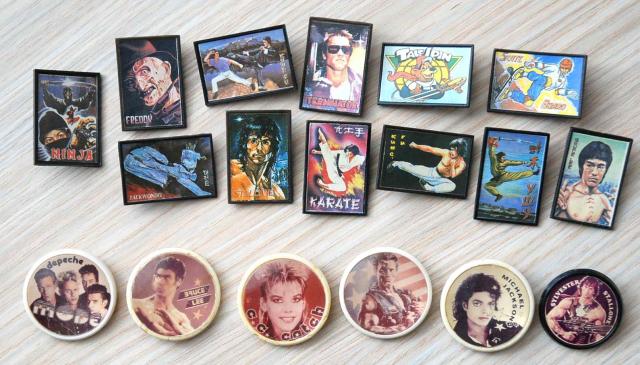 maždaug 1990-tųjų retro ženkliukai, kurie buvo parduodami spaudos kioskuose