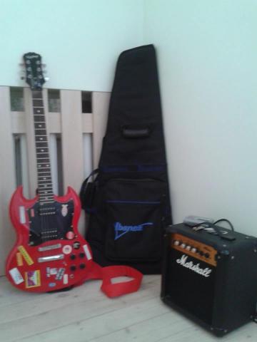Parduodu arba keičiu naudotą, bet gerai išsilaikiusią, be išorinių defektų Epiphone SG G-130 el. gitarą. Keistos stygos. Neveikia treble funkcija. Taip pat į komplektą įeina Marshall MG10CD kubas, gitaros dėklas, tiuneris. Komplekto kaina - 700lt