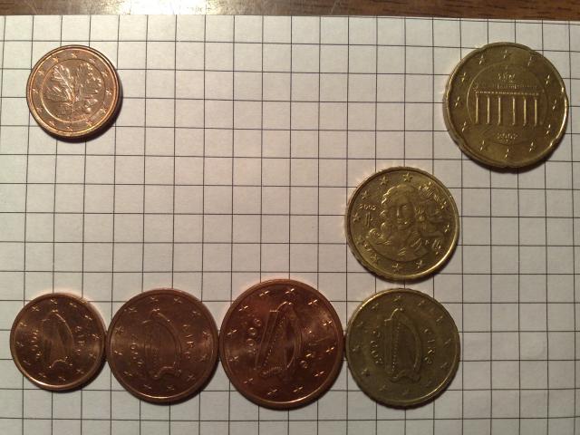 vokietijos: 1 ir 20 euro c. (po 1vnt) italijos:10 euro c.(1vnt) airijos: 1eur. c.(14vnt), 2 eur c.(13vnt), 5 eur c.(13vnt), 10 eur c. (5vnt). austrija: 1eur.c. (1vnt)