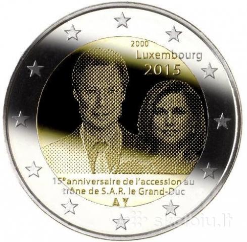 Aprašymas: Monetoje iškalti Jo Karališkosios Prakilnybės Didžiojo Hercogo Henri ir Jos Karališkosios Prakilnybės Didžiosios Hercogienės atvaizdai, o virš jų – įžengimo į sostą metai „2000“, monetą leidžianti šalis „Luxembourg“ (Liuksemburgas) ir išleidimo metai „2015“. Monetos apačioje iškaltas įrašas „15e anniversaire de laccession au trne de S.A.R. le Grand-Duc“ (15-osios Jo Karališkosios Prakilnybės Didžiojo Hercogo įžengimo į sostą metinės). Išorinėje dalyje (žiede) pavaizduota dvylika Europos Sąjungos