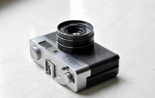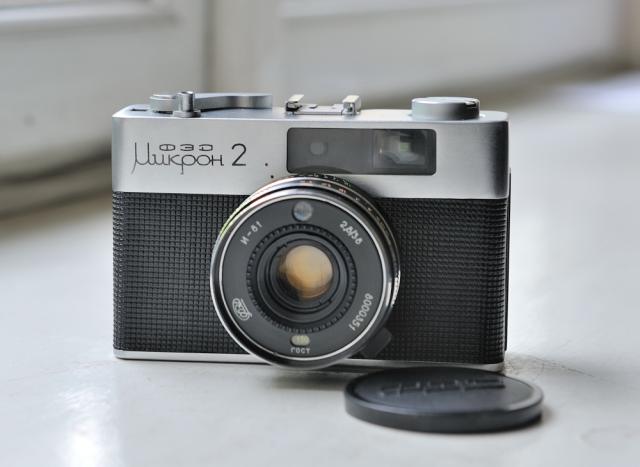 Labai puikios būklės, veikiantis fotoaparatas Fed mikron 2 su juodu dėklu.