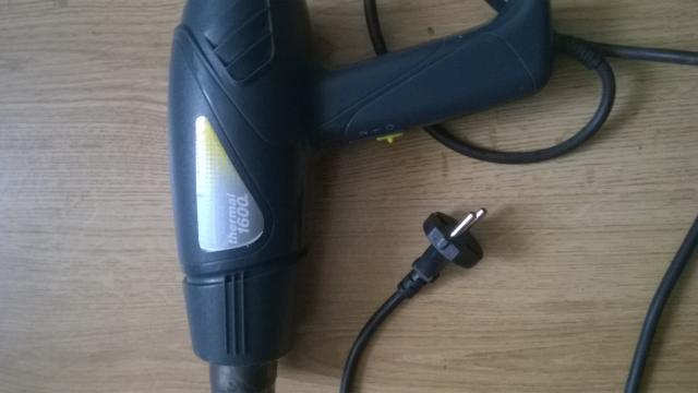 naudotas,bet vis dar puikiai veikiantis karšto oro pūtiklis.Reguliuojama temperatūra 60 arba 550 laipsnių. Oro srautas 280l/min. Galingumas 1600W.