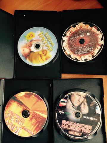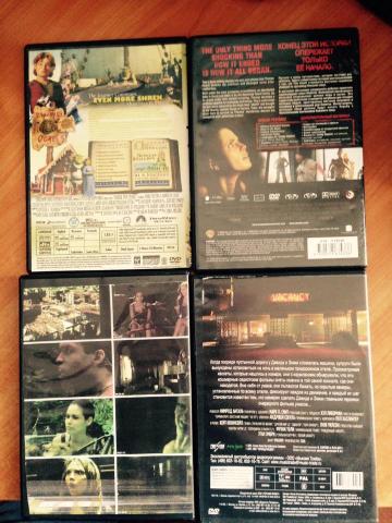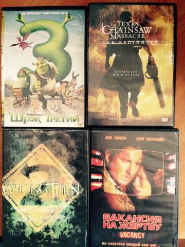 Trys filmai siaubo zanro, diskai orginalus, nesubraizyti, pavadinimai ( Lemtingas posukis 2, Kruvinos teksaso skerdynes, Viesbutis, ir vienas filmas komedija Srekas 3.