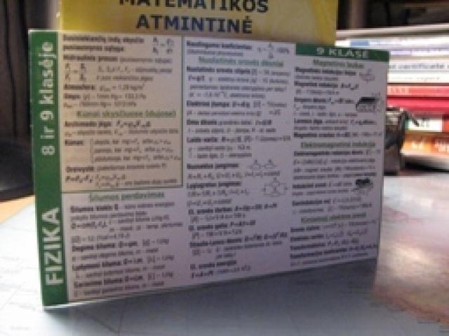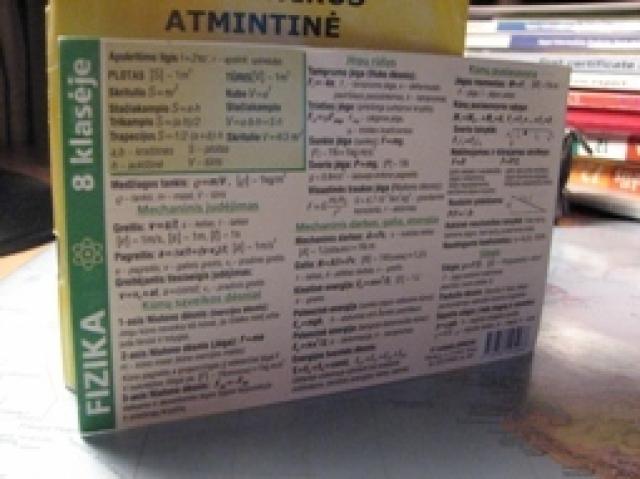 Fizikinės formulės, teorijos ir dėsniai: dvipusė kortelė skirta 8 ir 9 klasėms. Tokių turiu dvi.