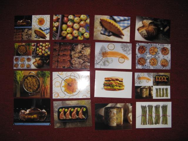 atvirutės labai kokybiškos, gražios ryškios nuotraukos įvairaus maisto, yra vokelis joms visoms laikyti, antroje pusėje daug vietos - galima užrašyti. yra apačioje receptai antroje pusėje mažu šriftu -anglų k.