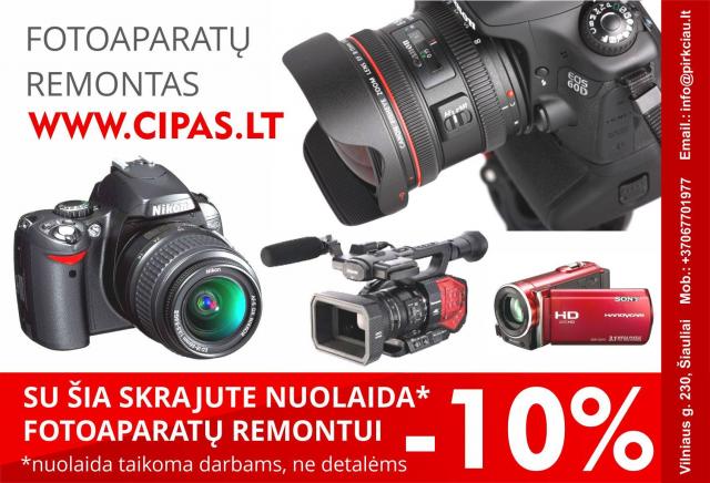 Visų FOTOAPARATŲ ir VAIZDO KAMERŲ REMONTAS Su šia skrajute Visų FOTOAPARATŲ ir VAIZDO KAMERŲ REMONTAS net -10% PIGIAU!!! Kaip bus suteikiama nuolaida? LABAI PAPRASTAI! Jums tereikia išsisaugoti šios skrajutės nuorodą / nuotrauką ir kreiptis pas mus: KONTAKTAI: +37063977277 / +37067701977 info@pirkciau.lt, www.cipas.lt Atvykite pas mus: Vilniaus 230 / Tižės 107, Šiauliai; Darbo laikas: I–V: 9-18 val., VI: 9-14 val. ŠALINAMOS ŠIOS FOTO/VAIZDO KAMERŲ GEDIMŲ PRIEŽASTYS: – neįsijungia, – įsijung