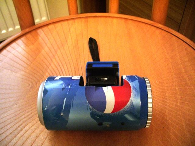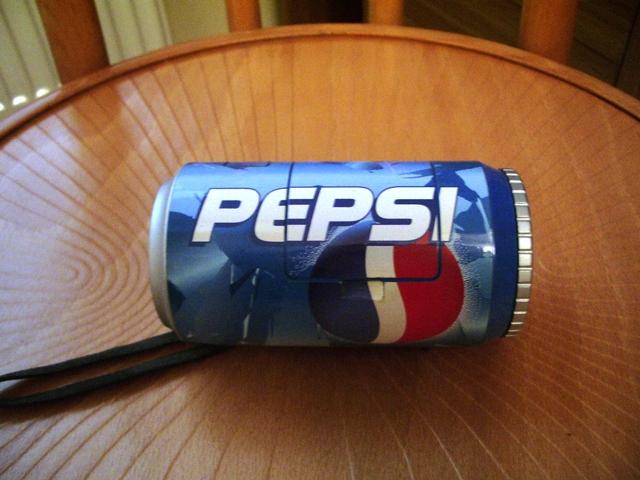 Juostinis fotoaparatas atrodantis lyg "PEPSI" skardine.