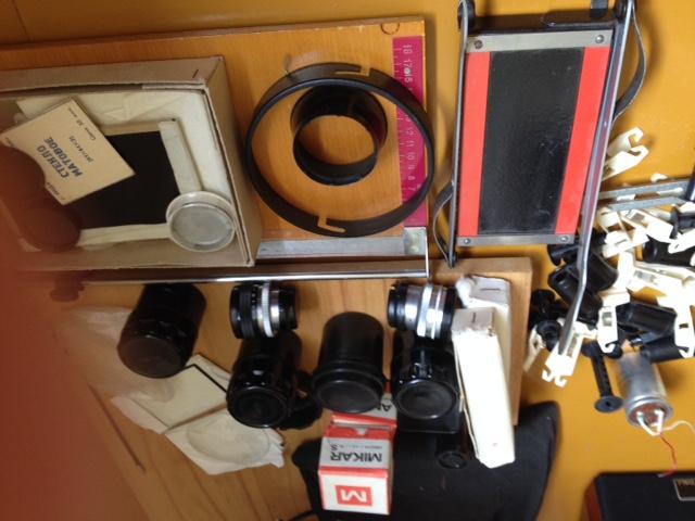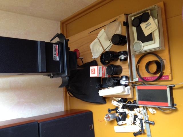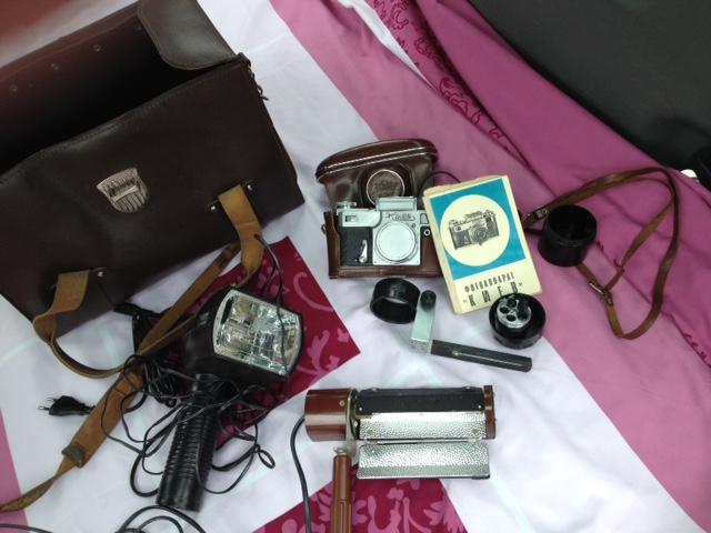 Parduodu veikianti didintuva Krokus su priedais( objektyvai, filtrai, papildomi padidinimo stiklai, nuotrauku dziovintuvas, laiko matuoklis, nuotrauku karpytuvas). Fotoaparatas Kijev su blykstemis ir lagaminu. Skambinti tel.869810610
