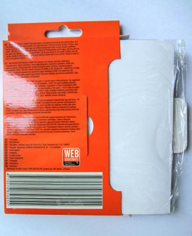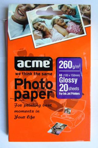 Acme fotopopierius A6 (100x150mm), 20 lapų, blizgus (glossy). Nenaudotas. Pakuotė pažeista, bet pats popierius įvyniotas į hermetišką celofaninį įpakavimą, kuris nepažeistas.