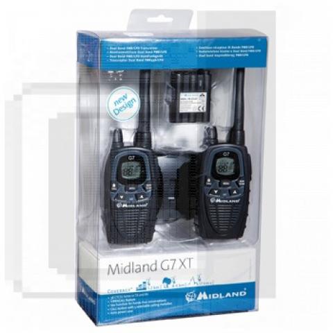 G7 Midland belicenzinė radijo stotelė MIDLAND G7 - tai dvi PMR/LPD standarto nešiojamos radijo stotelės. Stotelės turi visas nešiojamoms radijo stotelėms aktualias funkcijas. Gerai matomas LCD ekranas su apšvietimu, patogi meniu funkcija. Atitinka Europos PMR446 standartus Nesudėtingas valdymas 8 kanalų ( 8x32 pokanaliai ) Patikima ir patvari konstrukcija Patogus dydis ir svoris Integruotas valdymas balsu Sertifikuota Lietuvoje Komplektą sudaro 2 radijo stotelės su pakrovėju ir akumuliatoriais