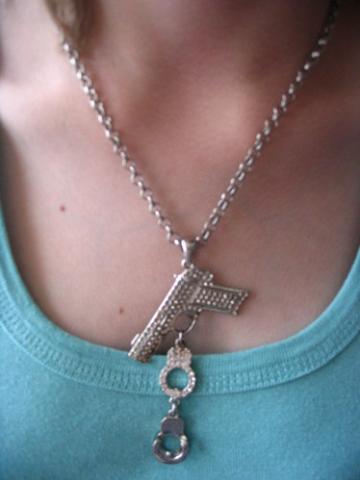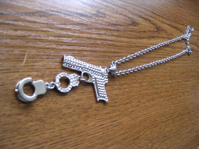 Gangsteriškas pakabukas su šautuvu ir antrankiais. Truputį antrankis aptrintas.