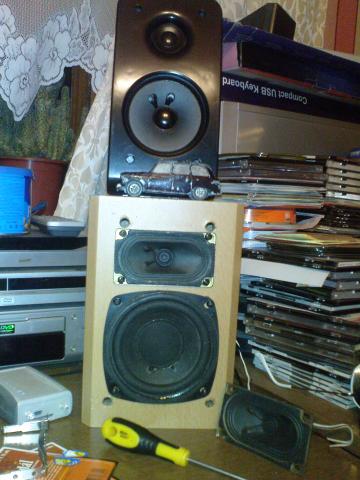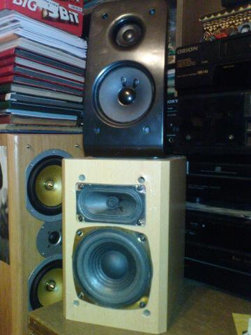 garso koloneles, garsiakalbiai.abieju poru aukstis po ~20cm. apatines - dezes sanyo, made in japan, garsiakalbiai is 2.1 pc garso sistemu subwuferiu, aukstu dazniu - is senos pc typhoon garso sistemos (pridedu 3ia atsargini toki pat), virsutines - nezinomos firmos, yra dangteliai.