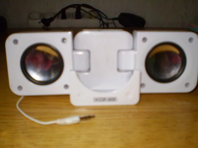 garso kolonėlės tinkančios telefonui ir mp3 grotuvui,dedasi keturios AAA baterijos,veikia puikiai....vienas defektas truputi apsibraize...