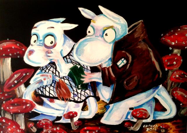 50x70 cm, akrilas, drobė. Originalas (pati tapiau :D). Du mumiukai musmirių lauke. Bet kas čia nutiko? Kodėl vienas kiša kitam pinigus? Kodėl tas kitas sumuštas? Kodėl jis su tinkline palaidine??? Puiki dovana tam, kuris jau išaugo iš mumių, arba pagyvinti svetainę gluminant svečius ką gi jie čia mato. Į kitus miestus siųsčiau per paštą/kurjerį. Jums reikėtų padengti siuntimo išlaidas.