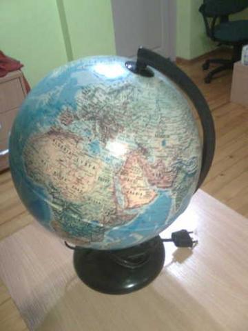 Plastikinis gaublys. 2 zemelapiai - isjungus pasvietima - topografinis, ijungus pasvietima - politinis (salys sviecia skirtingom spalvom)