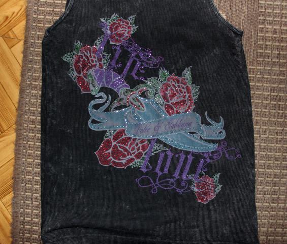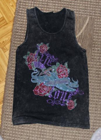 Nedaug dėvėta maikutė su piešiniu. Nurodytas dydis XXL, bet labai pamažinta ir tinka M/L. Jei reikia tikslių išmatavimų klauskite.