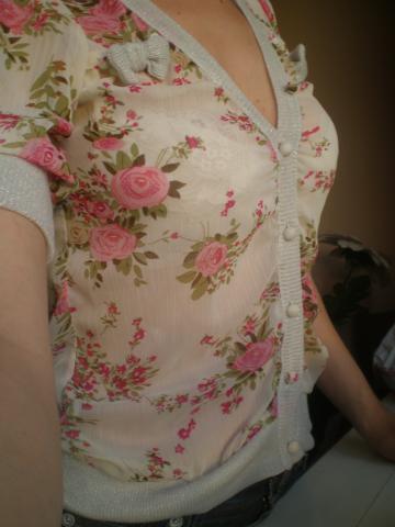 Gėlėta persišviečianti palaidinė su sagutėmis. Turi šiek tiek blizgesio.